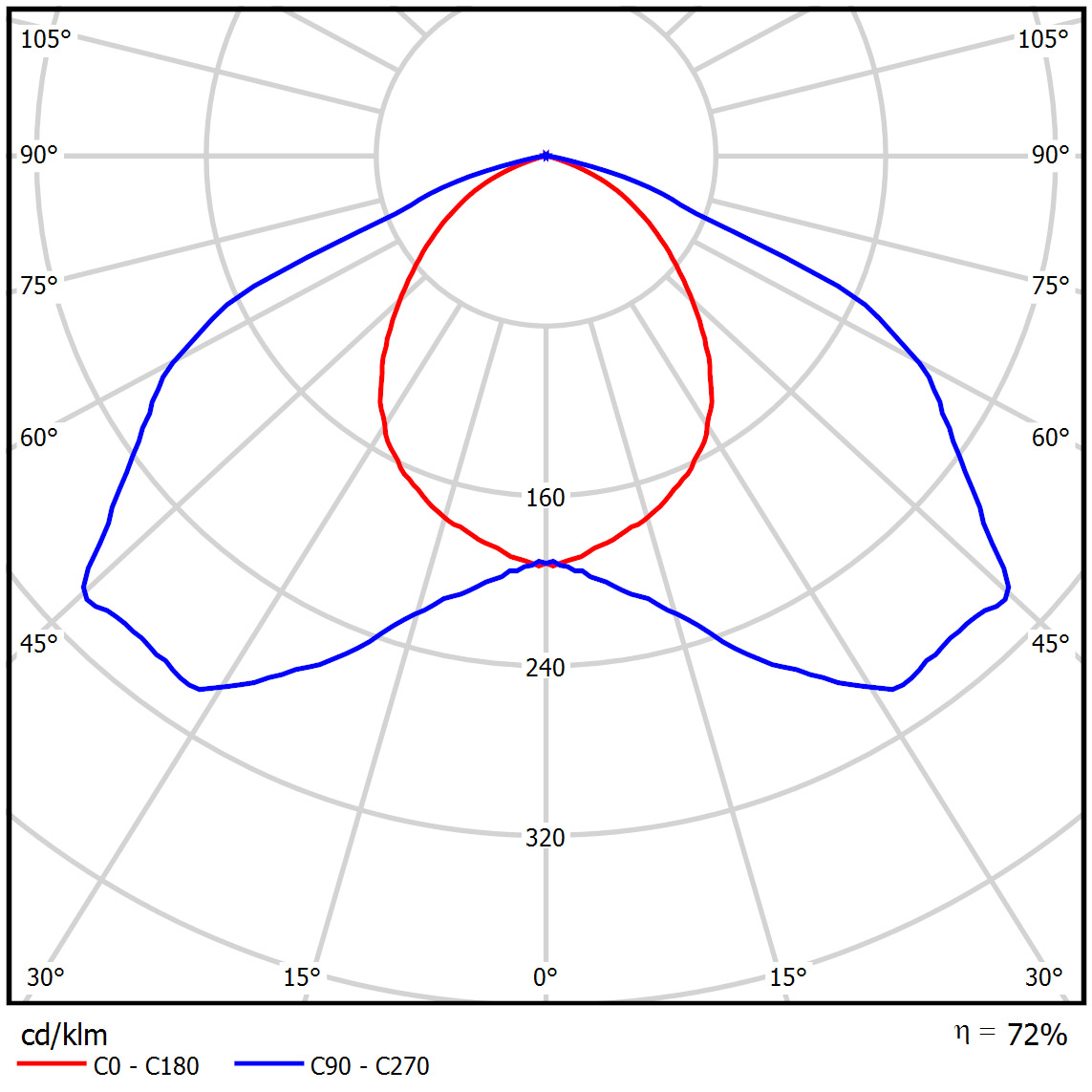 隧道燈和路燈是采用的蝙蝠翼形狀的配光曲線,具體呈現效果是矩形光斑。然而隧道燈和路燈的偏光需求還是有所不同,路燈的主流的安裝高度是6-9米。為了提高路面均勻度。兩側的配光需要多一些,配光曲線圖看上去翼的部位更大。