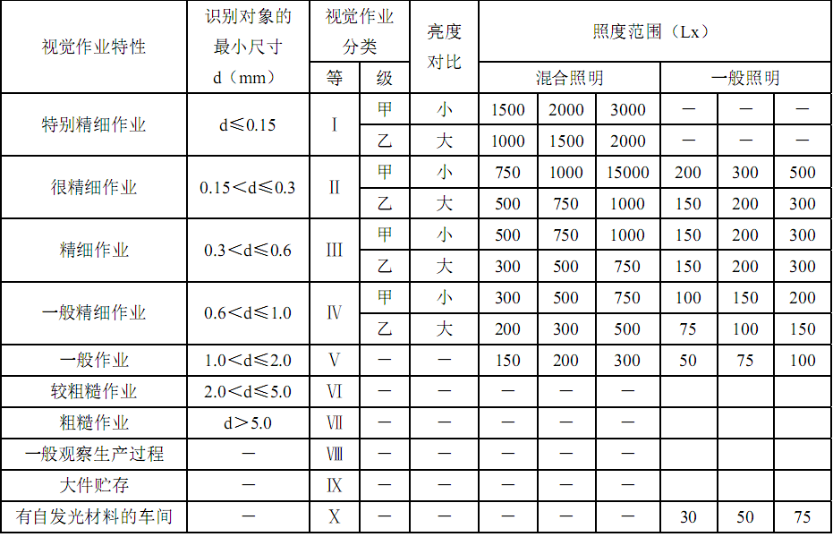 工業企業照明的照度標準值,應按以下系列分級:0.1、1、2、3、5、10、15、20、30、50、75、100、150、200、300、500、750、1000、1500、2000 和 3000Lx。